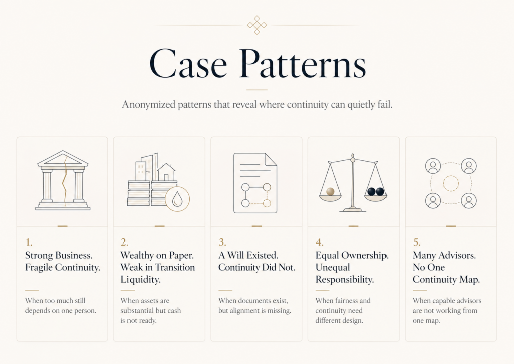 These are anonymized continuity patterns, not client disclosures. They show where families can appear strong while still carrying hidden continuity exposure.